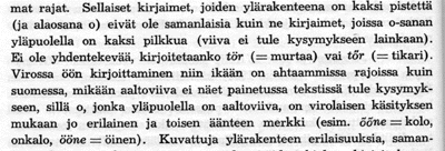 Kuvattuja ylärakenteen erilaisuuksia, samanlaisuuden rajoituksia, sanotaan eräiden näiden kielten kirjoituksessa käytettyjen kirjainten distinktiivisiksi piirteiksi. Distinktiivisten piirteiden esittäminen edellyttää kuitenkin itse joukot, joiden kesken on erilaisuuksia. Joukot ovat alkioidensa samanlaisuuden perustuksella muodostettuja tai muodostuvia. (142) The author first discusses the question what is meant by the autonomy of written language, often emphasised lately (for example by Sigurd Allén in his study Grafematisk analys som grundval for textedering, Göteborg 1965). Of course it cannot mean complete independence of written language from spoken language, for at least the alphabetic written languages have emerged on the basis of spoken languages. Genetically alphabetic written languages are in fact, as has been said, second-hand languages, epiphenomena. This historical fact does not, however, prevent written languages from being language systems in the way of spoken languages. Their optical signs are entirely different from acoustic signs of spoken languages. Their basic symbols do not cover the number of the basic symbols of spoken languages. Particularly we must discard the notion which previously prevailed and greatly contributed to the subordinate position of written language, that the referents of the expressions of written language always point to elements of spoken language. The referents of written language are in principle quite similar to those of spoken language. How written language is understood belongs to the study of silent reading. If something written is read aloud, it is being translated into spoken language. The result is spoken language, admittedly to some extent different from free speech. This mode of speech needs its own term, considering how common it is and also considering the fact that by means of it spoken language is influenced by written language. The author calls it reading-speech (which can, in the same way as free speech, be eye-to-eye speech, that is speech during which the speaker and the hearer see each other, or blind speech, during which the speaker does not see the hearer). (144) Although written Finnish, English etc. and spoken Finnish, English etc. are independent as language systems, the respective pairs are looked upon as identical languages. Is this justified? The reason is the isomorphism between the members of these pairs, whose existence is to be expected on the basis of the origin of alphabetic written language. If sufficient isomorphism does not exist, the sameness of a written language and a spoken language is out of the question. The relationship between written and spoken language has often been referred to as a matter of representation. Written language is said to be representative of spoken language. As this is not always the case, and as spoken language, on the other hand, can be representative of written language (for instance if something written is read to an audience), representation is linguistically of no significance. The clear understanding of the autonomy of optical and acoustic language systems has resulted in terminological formulations of increasing accuracy. In spite of this we still find uses reminding of the time when a letter denoted both acoustic and optical elements of language. A mistake of this kind is to say that phones are enclosed in brackets. Phones (or phonemes, for that matter) can never be marked off by brackets. The most notable of the more precise terms which try to serve the general notion of written language which is gaining ground is the introduction of the terms graph and grapheme (the latter of these two was used the first time by present author in an article on the relationship between written and spoken Finnish published in Virittäjä in 1932). The author shows that the accuracy aimed at by the use of these two terms cannot be achieved because everyday usage, to which also scholars are tied, prevents graph and grapheme from denoting different things in the way they were intended. It is characteristic of everyday language that among appellatives (such as graph and grapheme) some refer to entities as members of a certain group, while others refer to the group itself. An illustrative example is provided by the appellative letter. In some cases it refers to a visible entity as a member of a certain group (e.g. in the sentence This letter here is not correct), in others, again, it refers to a group (e.g. To the properties of letters belongs also their frequency). The same is true of graph and grapheme. In everyday usage they are no longer differentiated. Attempts have been made to provide graph with a referent belonging to reality, but it has definitely also manifestations referring to a group. If, for instance, I write on a paper with a pencil two graphite a's, I can say that they are graphs, but also that they are the same graph. In the latter statement graph refers to a group (as in (145) reality there are two separate things). The same is true in the case of grapheme. For this reason the elements of a set and the set itself must be denoted by expressions that differ from the everyday use of appellatives. The present author and Uuno Saarnio have in their article "Grundlegende Tatsachen der Worttheorie" (Erkenntnis IV, 1934) denoted the elements of a set of graphemes by grapheme t0 and the set by grapheme t1. The term graph is superfluous. The real graphemes i.e. the graphemes t0 form sets in several ways. The most important of these sets constitutes the basic graphemes of each written language. There are also sets of graphemes, the reading of whose elements is comparatively exactly defined. They are transcription graphemes. The objects of graphemics are: 1) the listing of the diachronic units of writing, the graphemes both the basic ones and other major graphemes of the language in question; 2) special attention has to be paid to the correspondence of the units of the written langu